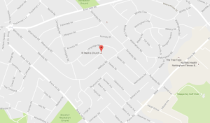Continue for about half a mile turning left into De Vere Gardens, the church is located at the end of the cul-de-sac.